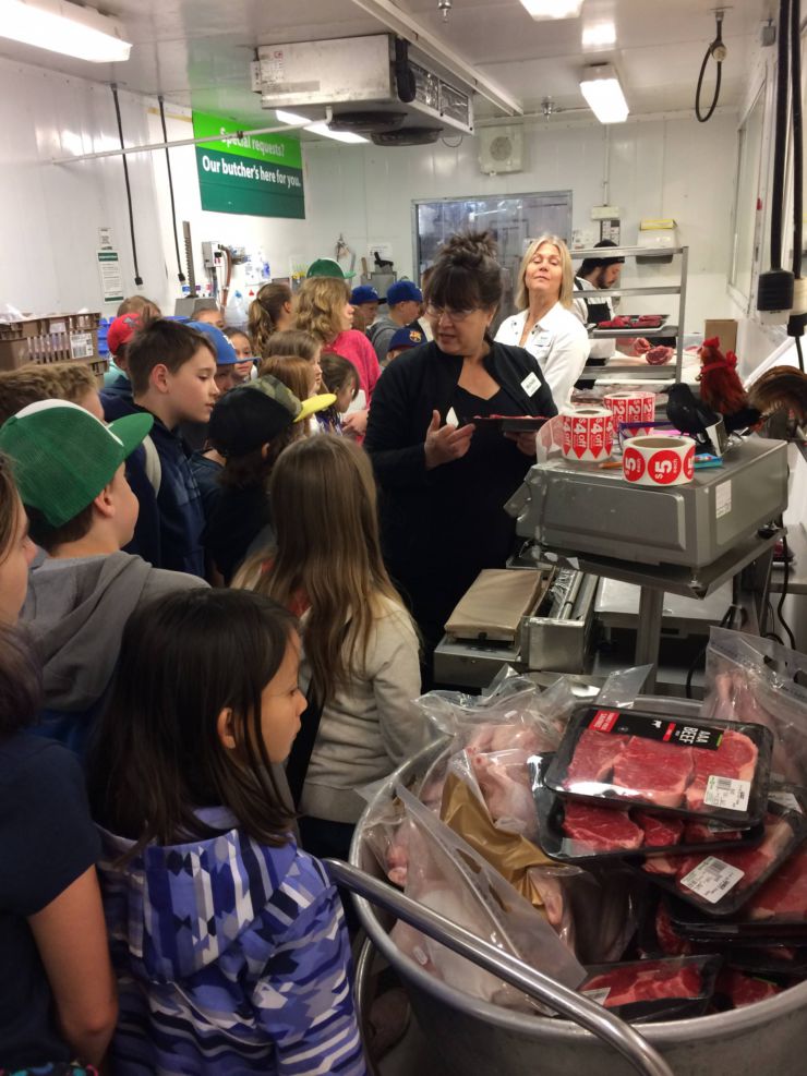 Then, on foot in the sunshine, the class headed out to Save-On Foods to look at some food choices at one of our local grocery stores. Karen, store manager, offered an extensive tour illustrating where much of the foods were imported from and highlighting the local and organic food choices available in store. The class enjoyed presentations from experts in the produce, deli, seafood, meat, grocery, bakery and dairy sections and finished with a fresh baked cookie, apples and strawberries. Thank you Save-On Foods!