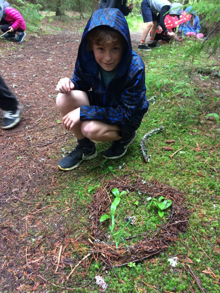 They contemplated the complex connections between soil, water, air and sunshine and all living organisms, including us. To consider how each organism plays an important role in the intricate web of life, students spun a web of connections while standing among the tall Hemlocks and Cedars. Their nature “selfie” artwork was left in the forest for the squirrels to admire.