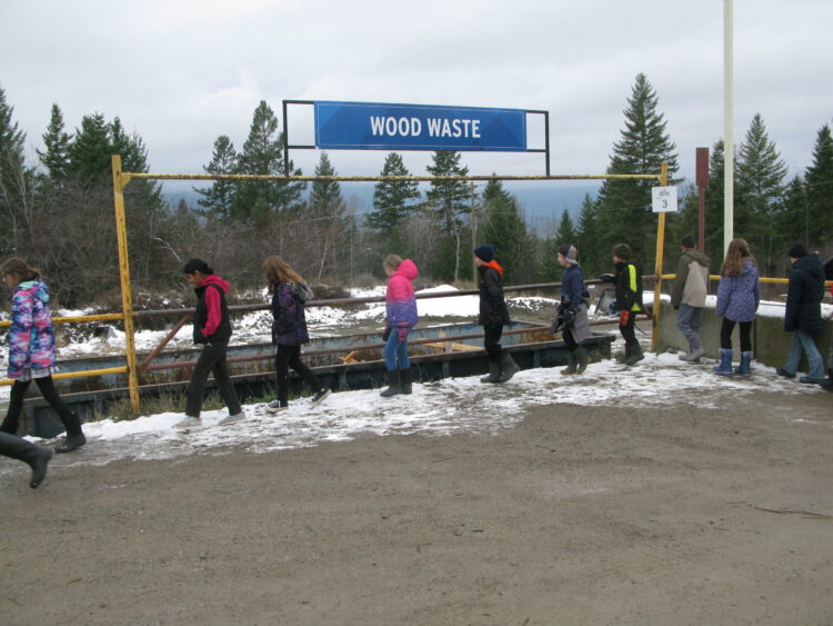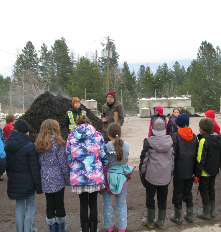 At the composting facility, Todd Johnston, RDCK Environmental Services Coordinator, showed us how compost and chipped yard waste are mixed together. These piles are aerated by a long perforated pipe, and turned. There were several different ages of compost piles. We could see the oldest piles looked like soil, and many were steaming. The students made connections with their own classroom compost pile. They mix leaves with the food scraps. Sienna asked ‘How hot do the compost piles here get?”. The RDCK compost piles need to reach 55C for 3 days to meet commercial compost regulations. The students were curious if their school compost will reach that temperature. They were eager to measure the temperature of their school compost pile soon.